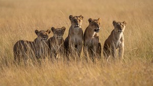 Was für ein Wahnsinns-Moment!! Die fünf jungen Rongai-Löwinnen nutzten einen flachen Termiten-Hügel, um über das hohe Gras hinweg nach der Büffelherde ein Stück vor ihnen Ausschau halten zu können. Die Mädels waren auf dem Foto erst zwei Jahre alt, erlegten aber bereits ausgewachsene Büffel (!!). Dies hatten Sie in bemerkenswert jungem Alter noch von ihrem Papa/Onkel Lorkulup, der ein begnadeter Büffeljäger war, lernen dürfen.
