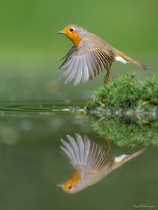 Ein startendes Rotkehlchen mit Spiegelung.