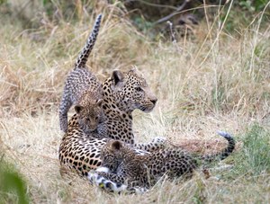 Gerade von der nächtlichen Jagd retour - dementsprechend müde- kehrte diese Leopardenmutter zu ihren beiden Jungen zurück. Die Freude der Beiden war groß und ausgelassen haben sie nicht nur miteinander sondern natürlich besonders gerne mit und auf ihrer Mama gespielt. Mit großer Gelassenheit und Geduld ließ sie ihre Jungen gewähren.