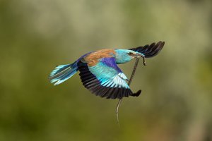 Die Blauracke im Flug mit einer erbeuteten Ringelnatter.