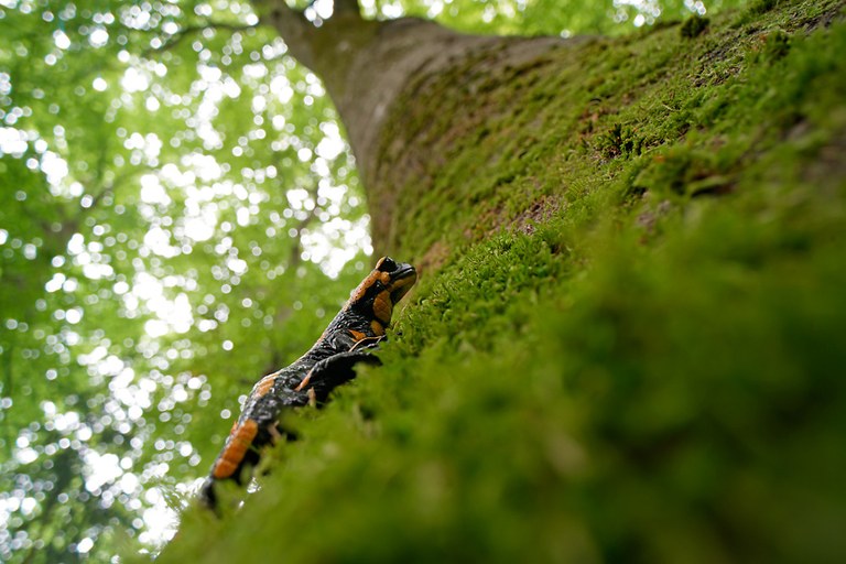 Feuersalamander können erstaunlich gut klettern. Als er mich gesehen hat, ist er ein Stück den Baum hochgeklettert.
