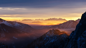 der aufgehenden Sonne leuchtet der Dunst über den Tälern wie Feuer.