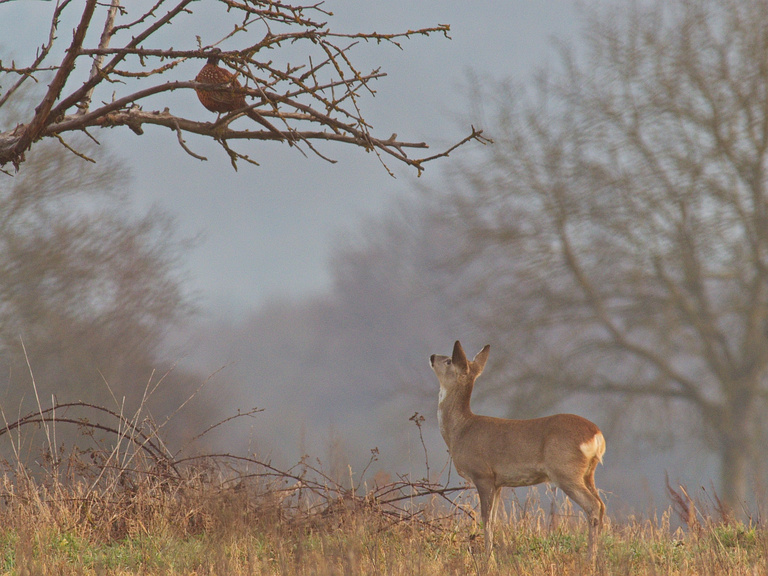 Beim Mrgenansitz bei ganz trübem Wetter am letzten Wochendene konnte ich über längere Zeit ein kleines Rehwildrudel beobachten, die langsam das noch verbliebende Gras abästen. Als ein Fasanenhahn mit lautem Flattergeräusch auf den Baum flog, erschrak daa am nächsten stehende Reh deutlich und blickte dann erstaunt nach oben, wer da wohl gelandet ist. Diesen Augenblick wollte ich dokumentieren, die fragende Haltung gefiel mir sehr. Die Quali ist aufgrund der Objektivkombi (kein AF) und der großen