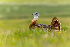 Die Grosstrappen sind schon imposante Erscheinungen. Mit bis zu 17 kg Gewicht gehören die ausgewachsenen Hähne zu den schwersten flugfähigen Vögeln überhaupt. Diese, leider überaus selten gewordenen Vögel beobachten und fotografieren zu dürfen, war schon ein einmaliges Erlebnis. Dieser Hahn war auf extensiv genutztem Grünland, seinem bevorzugten Lebensraum auf Futtersuche (Körner, Sämereien, Insekten, ...). Immer mal wieder schaut er zwischen der Futtersuche auf, um die Umgebung auf mögliche Fei