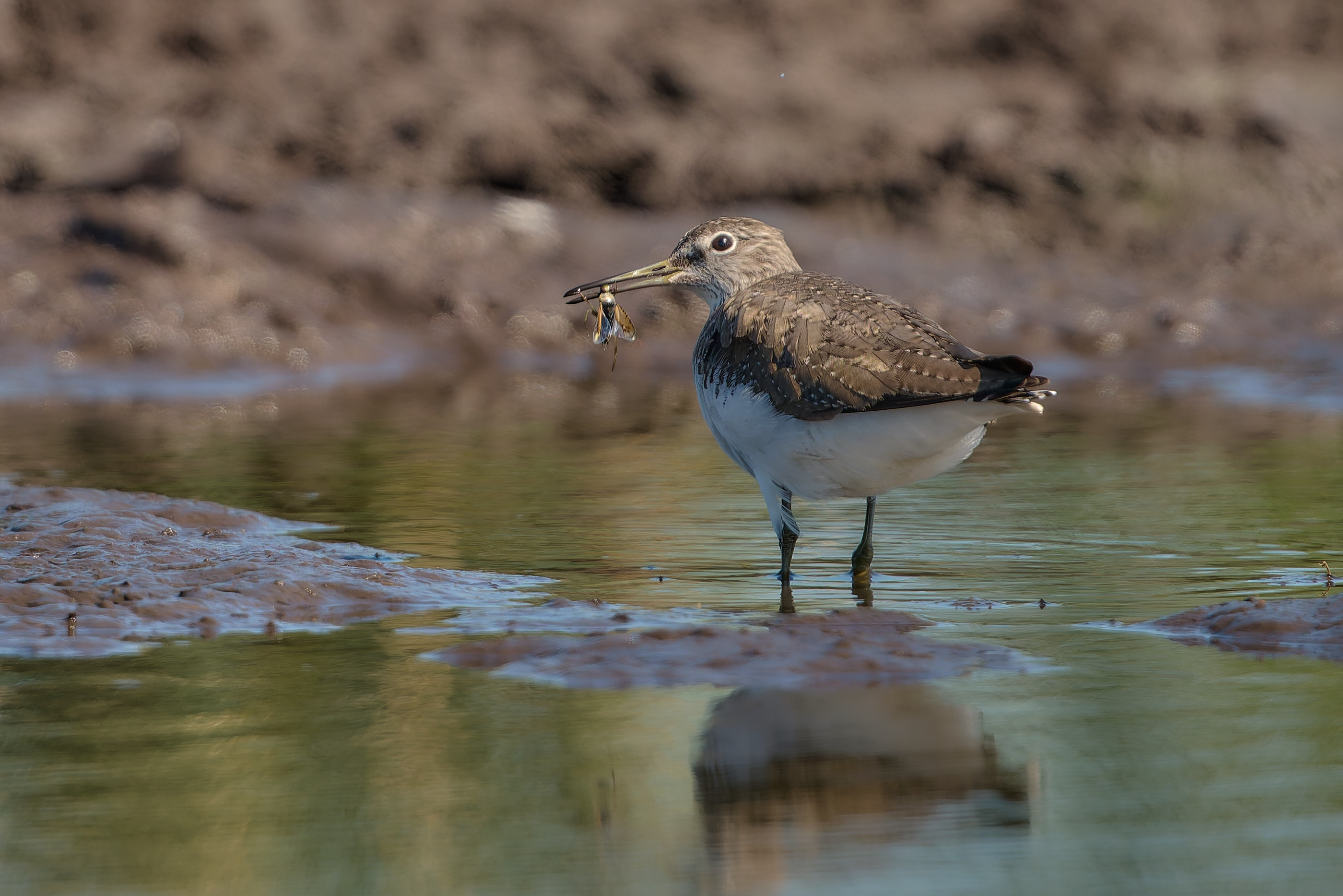 In einem Allgäuer Moor eine blauflügelige Sandschrecke - das hatte ich nicht erwartet. Der Waldwasserläufer hat sich sicherlich auch über den fetten Happen gefreut.