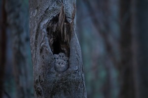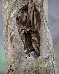 ich konnte nur gerade einen Zentimeter des Kopfes sehen, wusste ich, dass da wohl eine Waldkauzdame am brüten war. So besuchte ich sie während der nächsten vier Wochen möglichst oft und redete mit ruhiger Stimme mit ihr, um sie an meine Anwesenheit zu gewöhnen. Nach weiteren 10 Tagen stellte sie mir ihren ältesten Nachwuchs vor, jedenfalls kam es mir so vor. Als ich nämlich ankam, sass sie noch schützend auf den Kleinen, stand dann aber auf und setzte sich in der Höhle nach hinten, sodass der Nachwuchs sich auf das erhöhte "Podest" beim Höhleneingang setzen konnte. Was für bezaubernde Momente für mich und ich wusste noch nicht, dass sie gleich sechs Kinder aufzuziehen hatte. Meine "Reise" ging dann wirklich bis der letzte kleine Kauz die Höhle verliess und so kamen insgesamt 43 Besuche zusammen !!!! Dies war eines meiner allerschönsten "Projekte", welches ich über meine Hobbyfotografenzeit erleben durfte und ich könnte die Aufnahmen täglich wieder und wieder ansehen. |