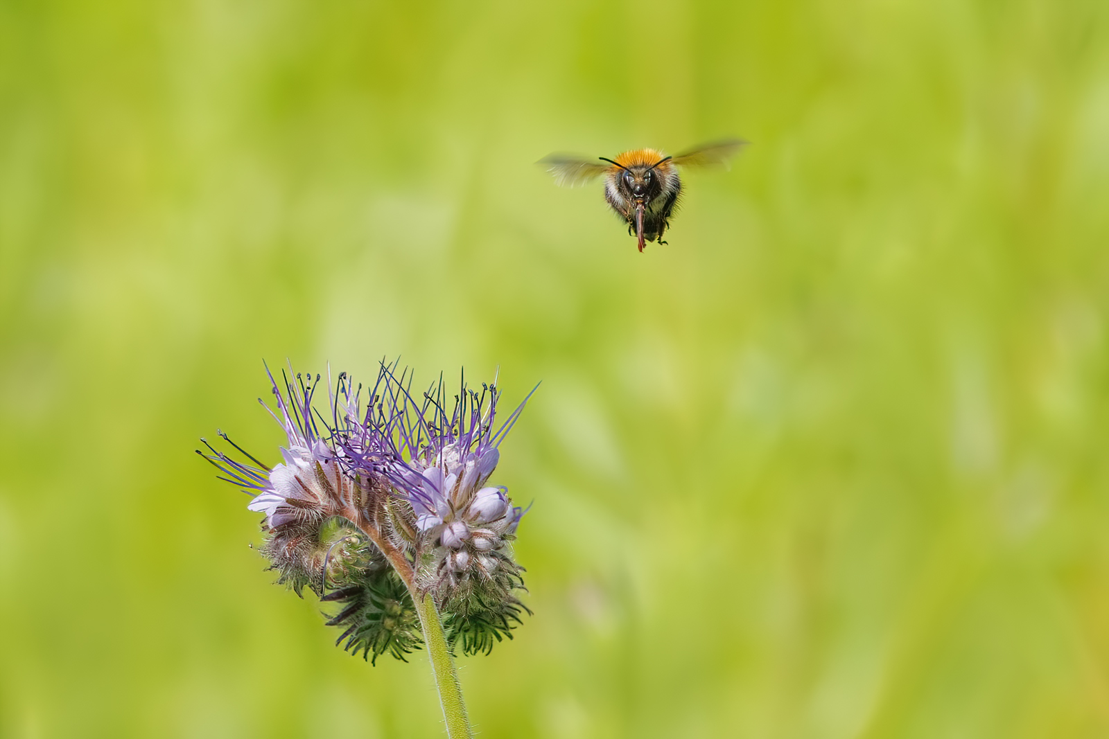 Heute Vormittag saß ich im Tarnzelt mit dem Ziel, einige Vögel zu fotografieren. Da jedoch kaum etwas los war, stellte sich Langeweile ein, bis ich eine Hummel aus weiter Ferne ins Visier nahm. Das Ergebnis hat mich mehr als positiv überrascht! Was haltet ihr davon?
