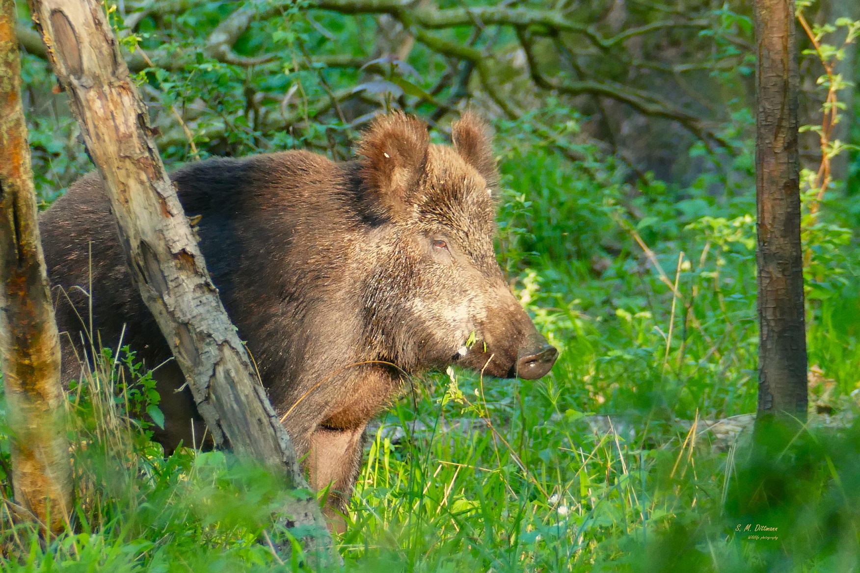 Eine Rotte von mehreren Tieren stapfte durch Morast auf eine dahinter gelegene Waldlichtung. Im Sonnenlicht ließen sie es sich schmecken.