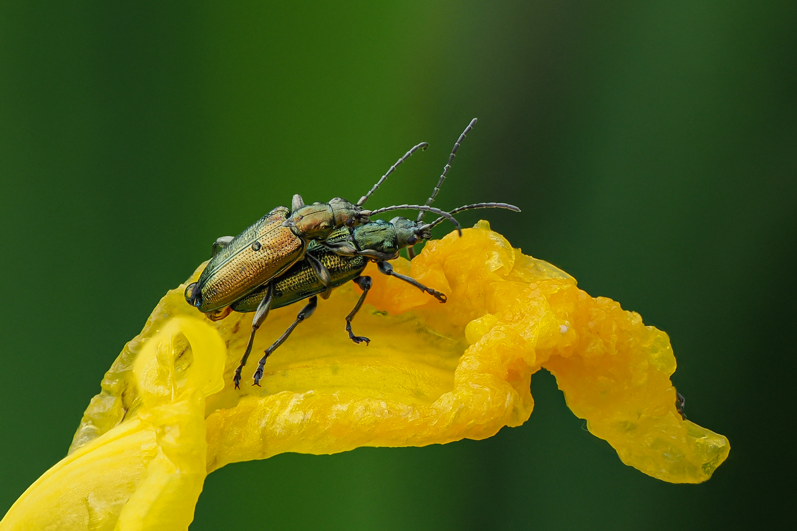 Die Art ist mit zahlreichen, schwer unterscheidbaren Arten vertreten. Deshalb verzichte ich hier mal auf eine genaue Bestimmung. Das Foto entstand nach einem Regenschauer. Die beiden Käfer paarten sich gerade auf einer Schwertlilie. Farblich fand ich das sehr ansprechend. Die Aufnahme ist ein Stack aus 13 Aufnahmen. Aus der Hand.