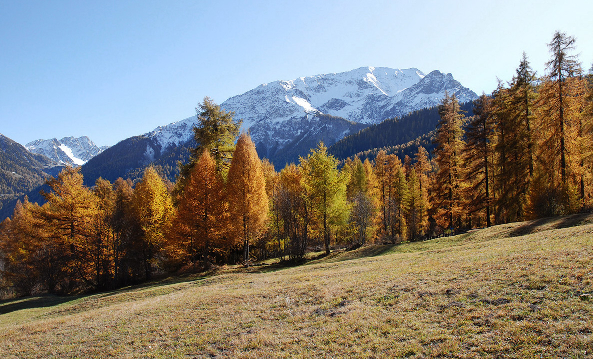 Hier zum Vergleich das Herbstbild im ursprünglichen 2:3 Formmat. Der Almboden ist zwar immer noch "schief", es fällt aber vielleicht nicht mehr so stark auf als im Panoramaformat.